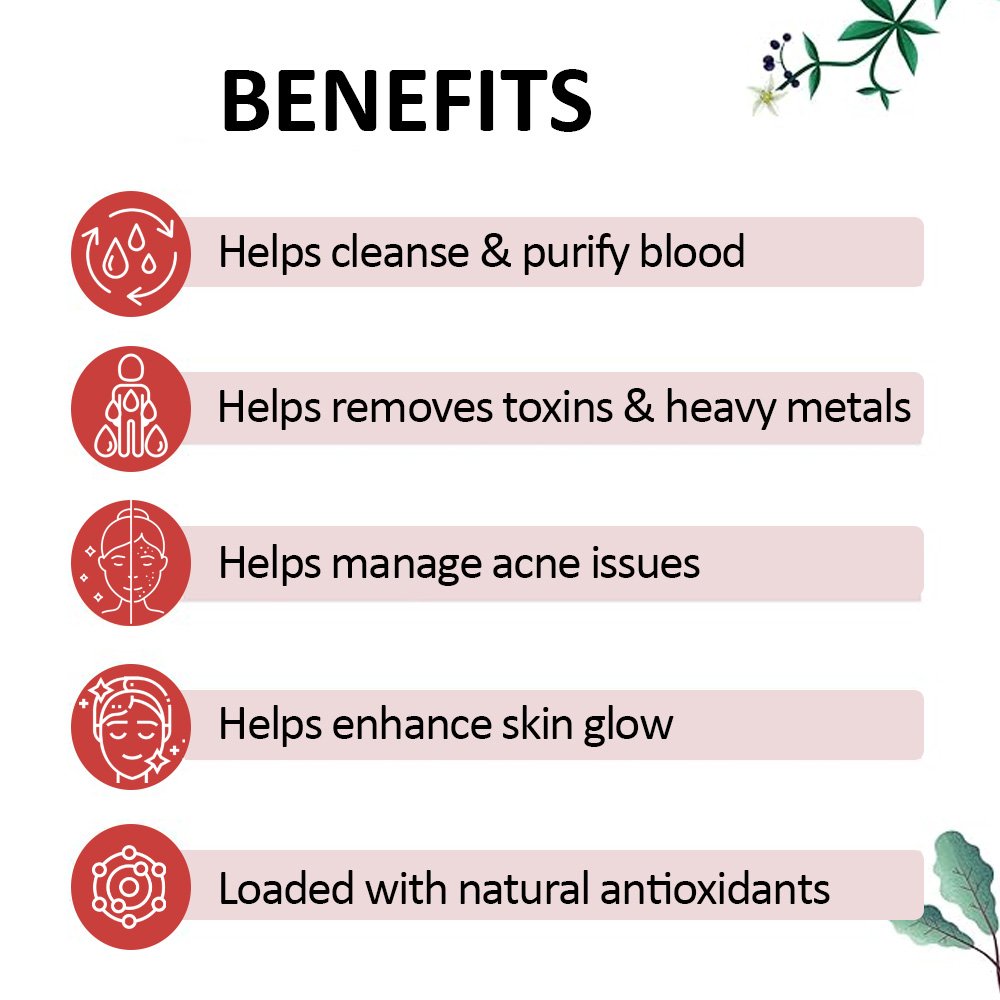 Traditionally being used as a blood purifier. Removes toxins from the blood & purifies blood. Beneficial in treatment of Acne-Pimple, Allergy and other general disorders due to toxins in blood.